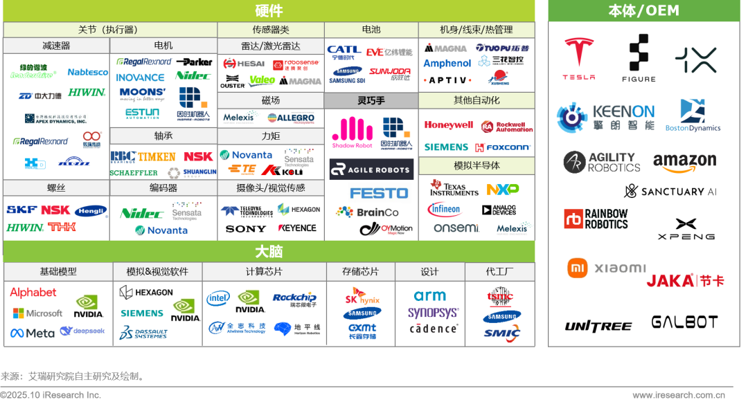 以大脑、硬件和本体为划分的代表企业示例