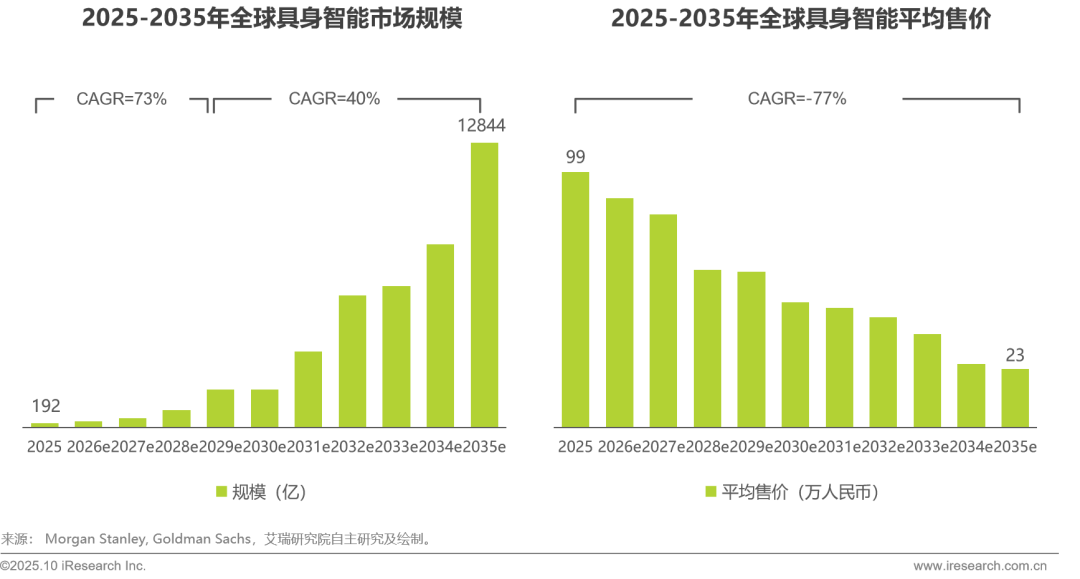 当前,具身智能仍处于大规模商业化的前夜,根据摩根士丹利、高盛等全球顶尖研究所预测,2025年全球具身智能规模达到192亿元人民币,且未来五年的复合增长率达73%,并预计在十年左右时间达到年万亿级市场需求。这一判断的关键变量即具身智能价格随着规模量产而下降,单台机器人的售价将从目前的百万级人民币在十年左右将至20多万,且在发展中国家的售价会更低。