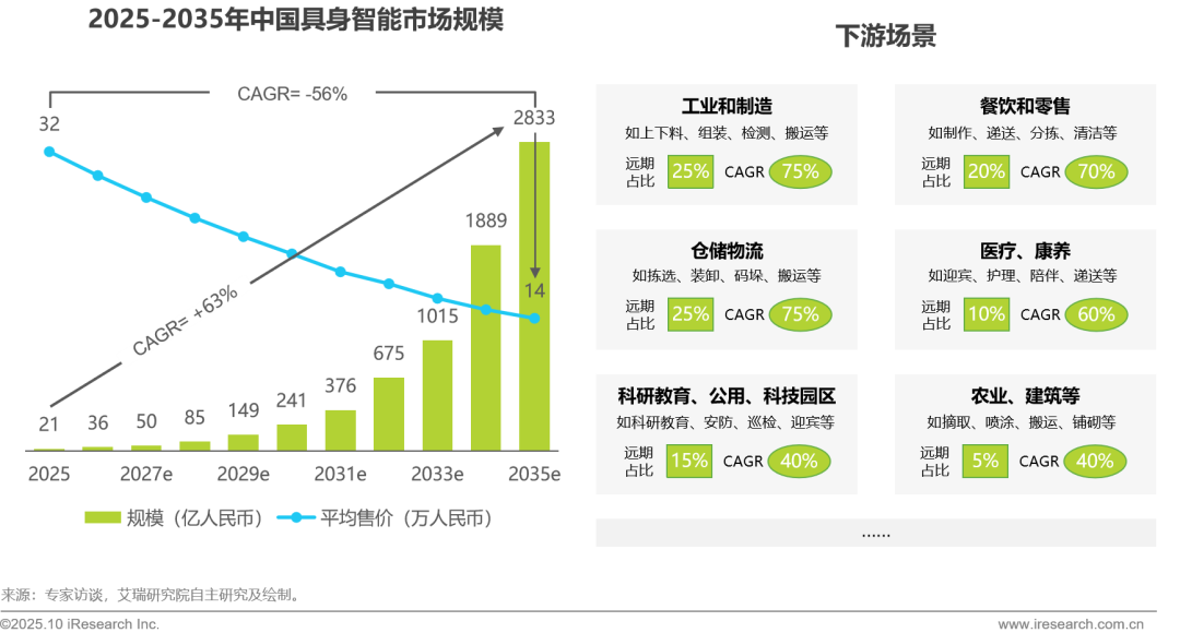 中国本土市场对具身智能的需求已初步显现,除政府鼓励带动的科研教育、公共场所和科技园区外,零售、餐饮以及头部汽车厂已尝试将人形机器人纳入较为简单的上下料、搬运环节。凭借全球最完善、最具竞争力的工业体系和供应链,中国预计会在五年左右进入快速降本通道,并在5-10年区间率先触及经济性拐点。保守估计,市场规模将从2025年21亿到2035年超过2,800亿,实现十年百余倍增长。