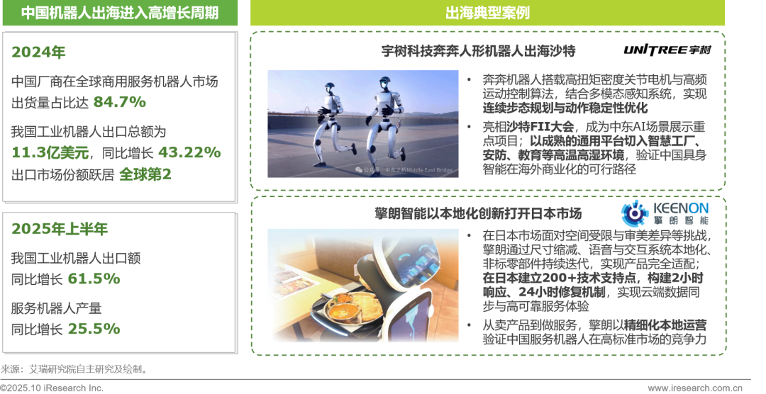 2024-2025 年,中国具身智能产业进入出海加速期,商业服务与工业机器人出口同比增长显著,形成全球第二大出口市场。代表企业正从“单点出货”迈向“体系化落地”阶段:上游以自研核心部件与算法驱动技术出海,下游通过本地化运营和服务体系实现长期渗透。宇树科技与擎朗智能的出海案例分别体现了技术自主创新与本地化适配两条典型路径,验证了中国具身智能在全球高标准市场的商业化可行性。