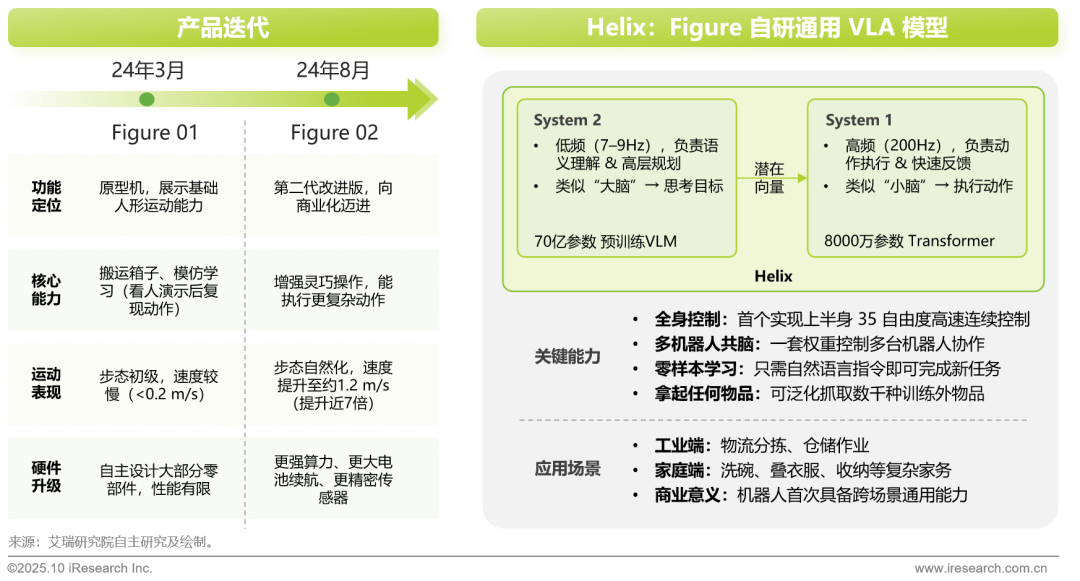 Figure AI 成立于 2022 年,总部位于美国,是全球专注于通用人形机器人的代表性企业。公司估值已达 390 亿美元,致力于通过具身智能打造能够在工业、商业与家庭场景中广泛应用的自主机器人。其产品 Figure 系列机器人经历了快速迭代,从早期展示基本运动能力的 Figure 01,到具备更强硬件和灵巧操作的 Figure 02,再到引入 Helix 自研通用 VLA 模型,逐步迈向能执行复杂任务、具备跨场景泛化能力的“类人劳动力”。