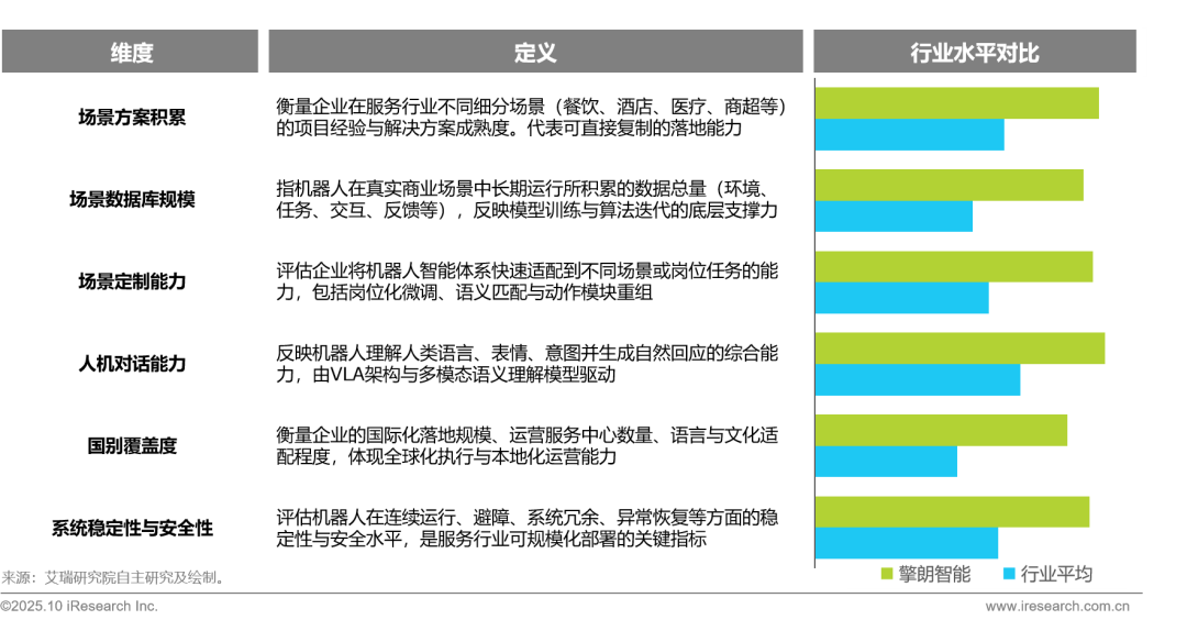 在具身智能的产业化竞争中,擎朗智能率先形成了以“场景理解 + 通用智能 + 岗位专精”为核心的系统化技术壁垒。公司在全球长期服务实践中沉淀出丰富的真实任务与环境数据,构建了业内最完整的场景知识体系与算法反馈闭环。在场景方案积累、数据库规模、岗位定制能力、人机对话能力、全球覆盖度及系统稳定性六大维度上,擎朗均显著高于行业平均水平,展现出从“可落地”到“可规模化复制”的技术成熟度。这一领先的综合技术力,为其后续多场景协同与通用人形机器人商业化应用奠定了坚实基础。