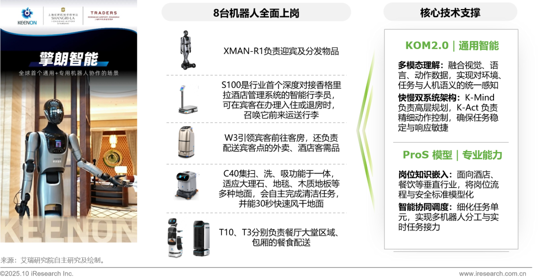 2024 年 10 月,香格里拉集团旗下的上海虹桥机场盛贸酒店正式启用 8 台擎朗具身机器人,覆盖迎宾、配送、清洁等核心服务岗位,成为全球首个“通用 + 专用”机器人协同运营的智慧酒店。本项目由擎朗智能自主研发的 VLA 大模型 KOM2.0 与垂直优化模型 KEENON ProS 提供智能驱动,通过“岗位化”设计实现多类型机器人协同与任务分配标准化。该合作不仅展示了中国具身智能技术的商业成熟度,也为高端酒店行业的智能化运营提供了可复制的验证样本。