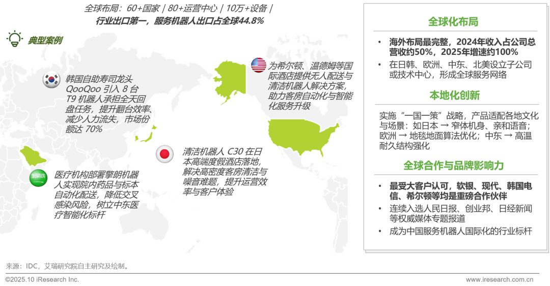 依托全栈自研与产业化能力,擎朗智能正以“通用智能 × 本地化创新”双轮驱动,在全球范围内构建覆盖60余个国家、80+运营中心的服务机器人网络。公司在日韩、欧洲、中东、北美等市场建立子公司及技术中心,形成研发、生产、销售与服务一体化的全球运营体系。通过“岗位化”理念与多模态算法优势,擎朗实现了产品与场景的本地化适配与智能化迭代,推动服务机器人从单一场景落地向全球规模化复制迈进,成为中国具身智能出海的技术与商业化标杆。