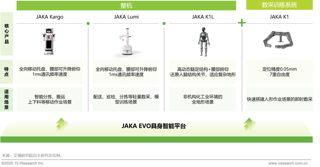 节卡有丰富的具身智能产品矩阵,从灵巧协作的机器人整机(如JAKA Kargo, Lumi)到面向数据采集与训练的系统(如K1),覆盖了具身智能从感知、决策到执行的关键环节。同时还研发了EVO具身智能平台为产品的智能底座,赋能节卡机器人实现自我感知、自主学习与适应性进化,从而打造了软硬件一体、高效协同的具身智能生态。