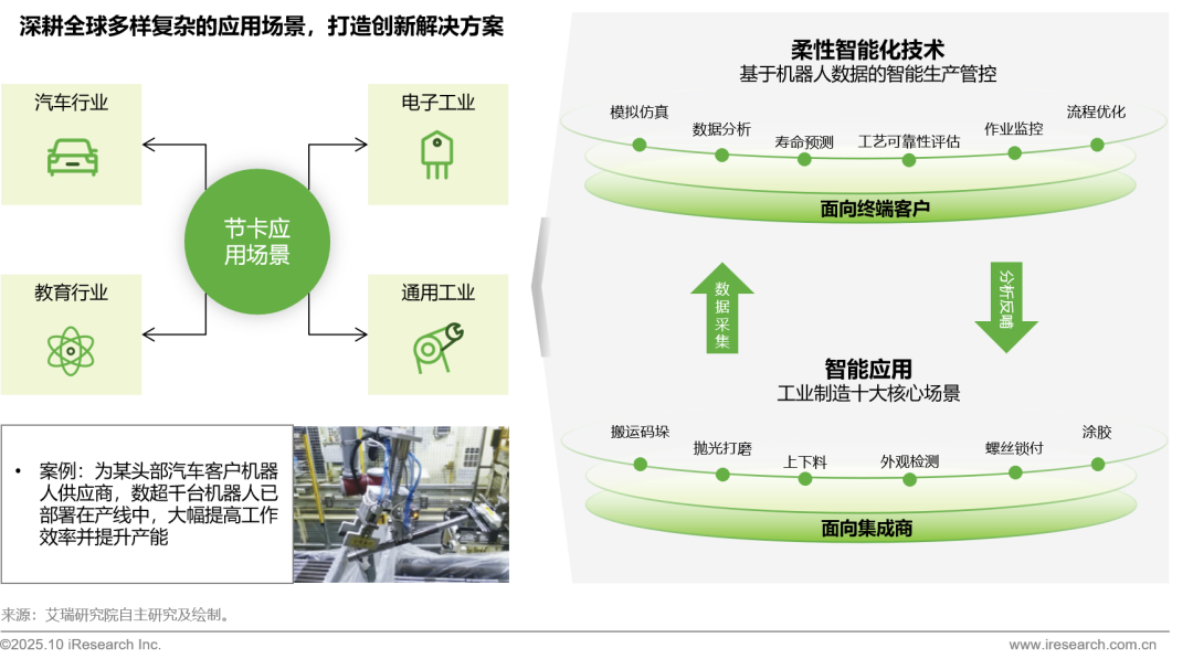 节卡凭借多年的产品研发和客户沉淀,打造了具备深厚垂直行业know-how的解决方案,已在汽车、电子等复杂工业场景开展大规模部署,从而有机会获取海量、高质量的运行数据。这些数据反哺其具身智能技术平台,为终端客户提供进一步深度价值,同时又将成熟的工艺模型和应用能力开放给集成商,极大地降低了机器人应用的门槛和成本。