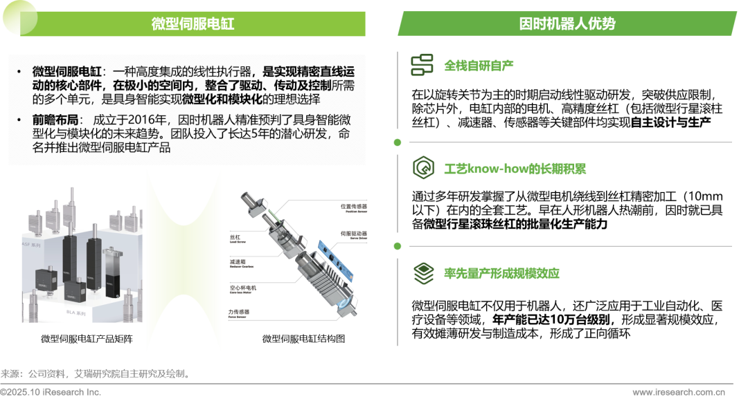 具身智能的可靠性和准确性催生了灵巧手,而灵巧手的发展高度依赖于执行器技术的突破。传统的伺服系统体积大、集成度低,难以满足新一代具身智能,特别是人形机器人灵巧手对空间、精度和响应速度的极致要求,微型伺服电缸是驱动灵巧操作的关键技术节点。因时机器人是微型伺服电缸的领导者,实现除芯片外全栈部件的自研和规模化量产,也推动了在多个领域的商业化落地。