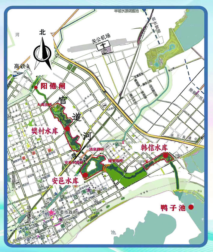 2021年4月,总投资25.81亿元的官道河生态修复与整治工程开工建设。整个项目北起官道河盐湖区阳倦闸,向南穿越中心城区,连接樊村水库、安邑水库、八一水库等,最终与鸭子池相连,形成“一河四库”的城市生态走廊。该项目主要通过河道疏浚、河库整治连通、生态修复、景观建设等措施,完善官道河防洪、灌溉、供水、抗旱、生态五大功能,提高防洪排涝能力,改善中心城区水环境质量,打造城水相依的生态宜居城市。工程采取EPC总承包模式,由市水务局牵头实施。
