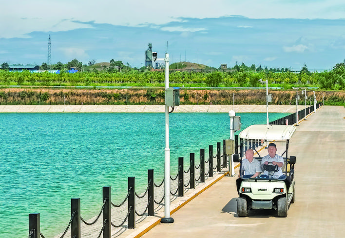 为了确保“水塔”存得住水,建设者们在防渗工程上做足了文章。“原土翻夯2米厚,再铺50厘米水泥土,加上‘两布一膜’的防水处理,最后覆盖50厘米素土对土工膜进行保护。”负责人指着库区边缘的土说,经过这些工序,可以有效防止调蓄库出现渗漏问题。