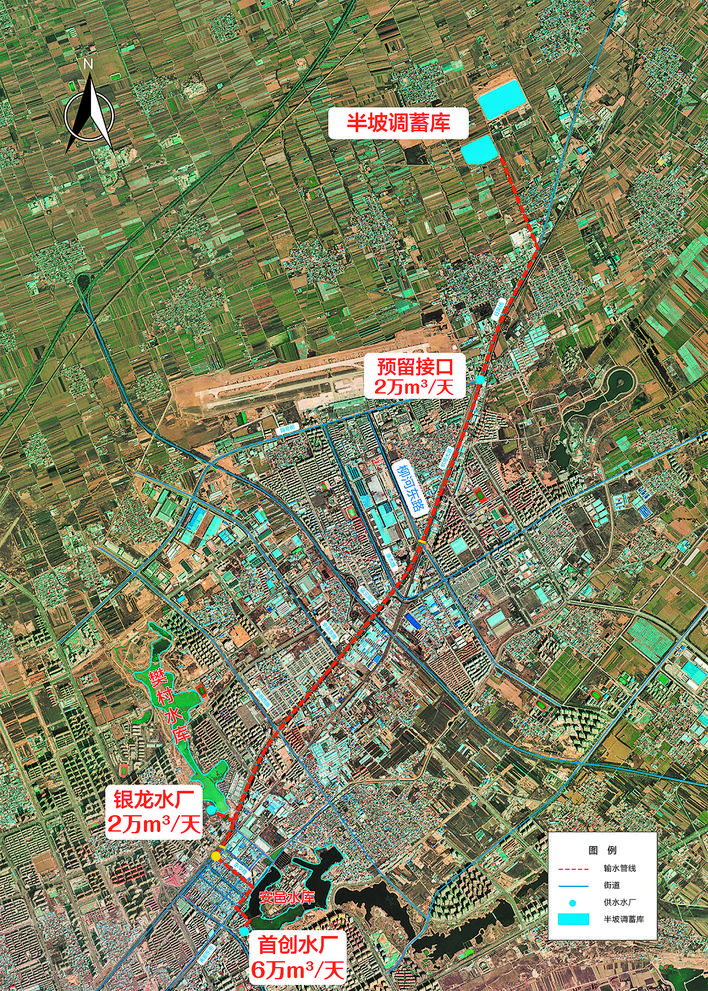 从半坡调蓄库出发,两条并行的TPEP防腐钢管开始在地下延伸,途经G342日凤线、机场大道、南同蒲铁路等交通干线,最终抵达银龙水务水厂和首创水务水厂。这条全长12.34千米的城区水源输水管线,如同城市的“主动脉”,将半坡调蓄库的清水源源不断输送至千家万户。