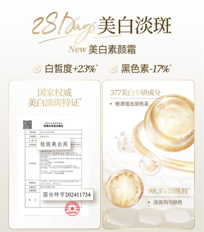 最让消费者期待的是:卡姿兰美白素颜霜真正意义上能实现越用越白,“一直用一直白”的消费需求。它采用377「WHITE PRO」焕白体系,添加377美白专研成份,从根源狙击黑色素,减少色素沉积,每化一次妆等于做了一次美白护理;搭配SKIN REVIVE 焕肤抗氧体系与98.5%高精纯烟酰胺,多链路实现美白淡斑效果,并取得国家权威美白淡斑特证。