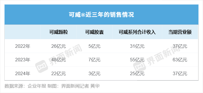 但和颗粒剂型相比,胶囊剂型并不是可威®的主力产品。在2017年-2018年,可威®胶囊的营业收入分别为4.4亿元、6.3亿元,占比27%、25%;同期,颗粒剂型的收入是10亿元、16亿元,占比60%、64%。