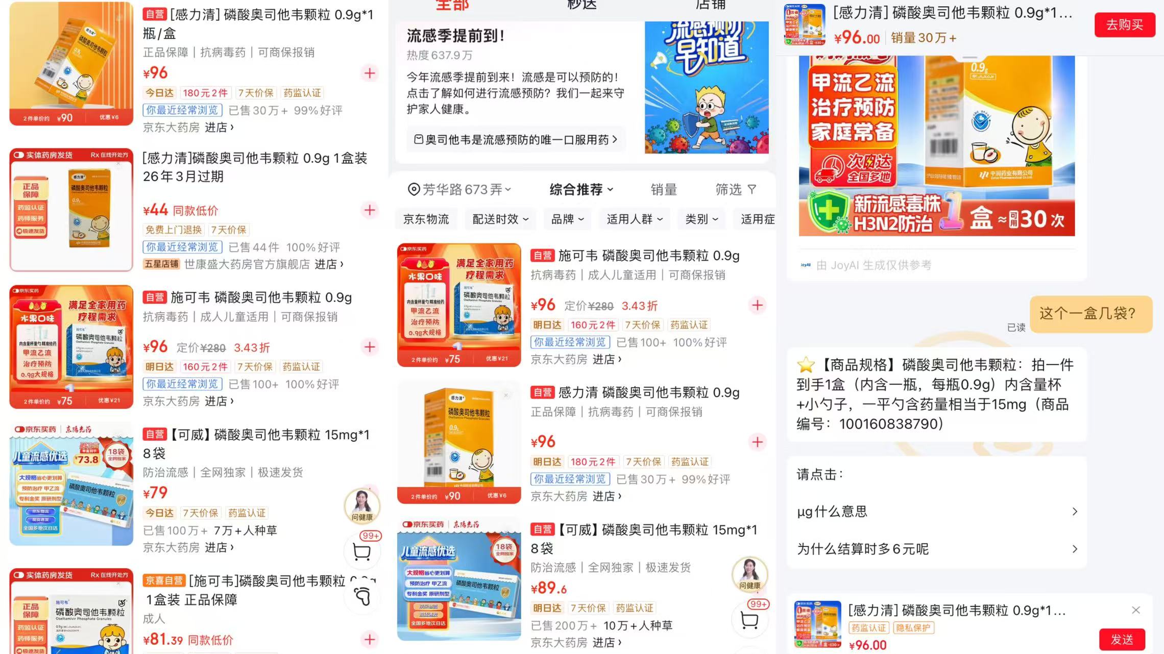 同一时间,界面新闻记者也搜索到了感力清®磷酸奥司他韦颗粒0.9g*1瓶/盒,以及施可韦®磷酸奥司他韦颗粒0.9g*1瓶/盒的产品价格,皆为96元。