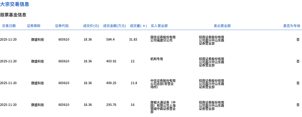 11月20日,麒盛科技大宗交易成交91.63万股,成交额1682.33万元,占当日总成交额的11.24%,成交价18.36元,较市场收盘价19.99元折价8.15%。