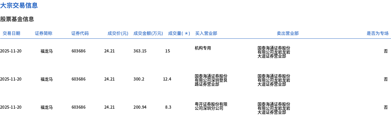 11月20日,福龙马大宗交易成交35.7万股,成交额864.29万元,占当日总成交额的0.29%,成交价24.21元,较市场收盘价27.79元折价12.88%。