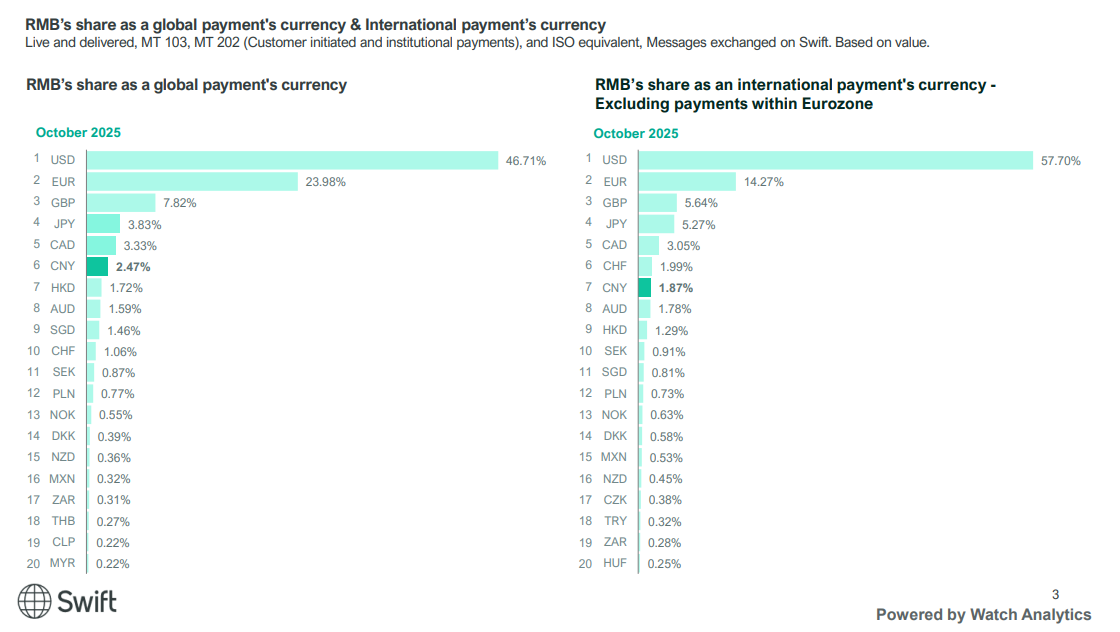 环球银行金融电信协会(Swift)11月20日发布人民币月度报告和数据统计显示,10月,在基于金额统计的全球支付货币排名中,人民币排名全球第六大最活跃货币的位置,占比2.47%,以欧元区以外的国际支付作为统计口径,人民币位列第七,占比1.87%。