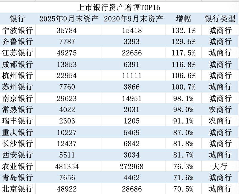 从个体看,这一变化更加明显。界面新闻记者根据同花顺ifind数据整理发现,2020年9月-2025年9月资产扩张最快的15家A股上市银行有12家为城商行。其中,7家实现资产翻倍,3家增幅在85%左右、接近翻倍,余下两家增长约71%。