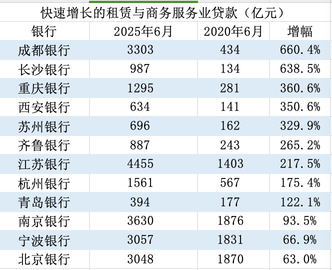 这些变化在财报中也有印证。企业预警通数据显示,2020年6月-2025年6月前述12家城商行租赁与商务服务业贷款增幅大多高于100%,其中7家高于200%。这意味着,该行业贷款的增长是推动城商行扩表的关键。