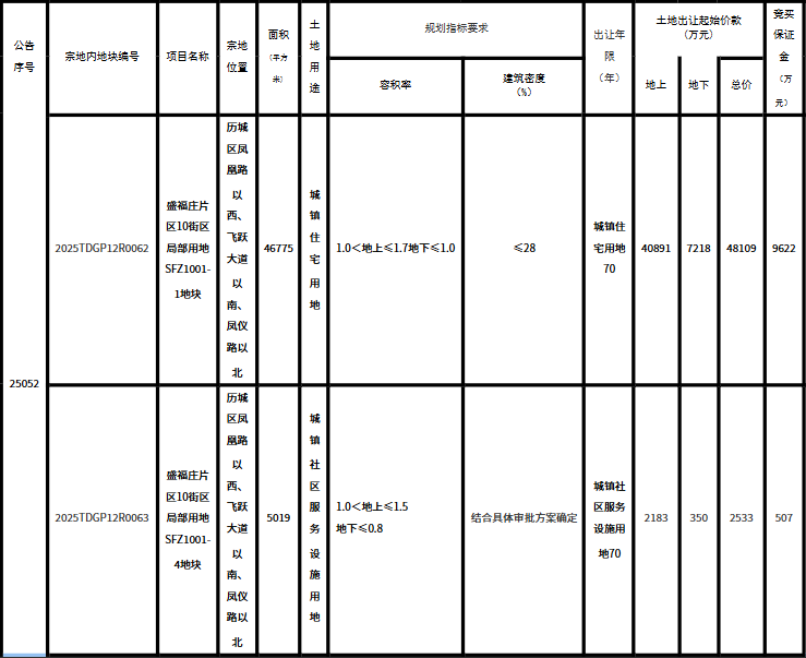 据济南公共资源交易中心发布的公告,11月18日,历城区盛福庄片区10街区局部用地SFZ1001-1地块(蟠龙山建材厂地块)正式挂牌,地块位于凤凰路以西、飞跃大道以南、凤仪路以北,紧邻地铁2号线与6号线换乘站凤凰路站,交通优势显著。该地块土地面积约4.68万平方米,容积率1.7,地上建筑面积约7.95万平方米,起拍楼面价为6050元/平方米,起始总价约4.81亿元。