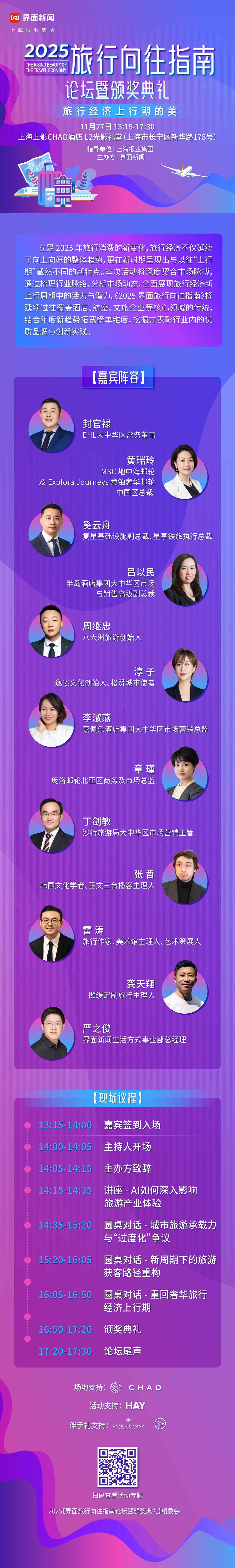 当旅行消费迈入品质升级的上行周期,一场汇聚行业智慧与市场趋势的文旅盛会即将启幕。《2025 界面旅行向往指南》活动定于2025年11月27日星期四,在上海正式举行。