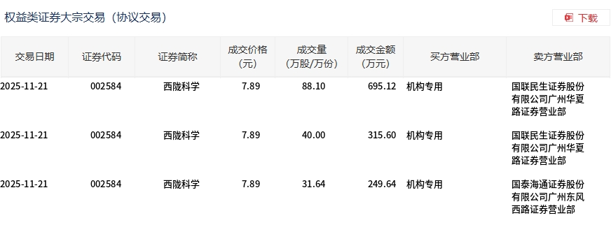 11月21日,西陇科学大宗交易成交159.74万股,成交额1260.36万元,占当日总成交额的2.24%,成交价7.89元,较市场收盘价8.88元折价11.15%。