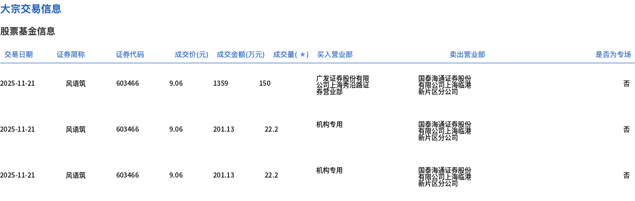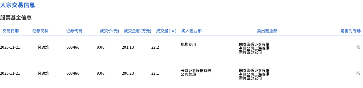 11月21日,风语筑大宗交易成交238.7万股,成交额2162.62万元,占当日总成交额的4.48%,成交价9.06元,较市场收盘价10.12元折价10.47%。
