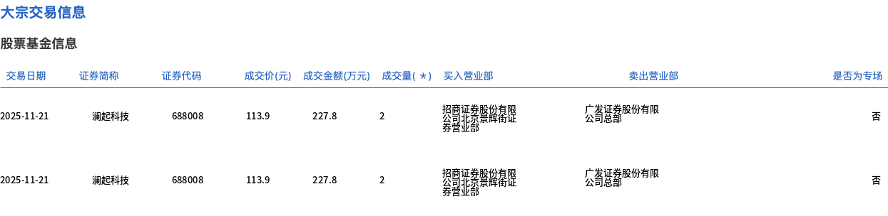11月21日,澜起科技大宗交易成交4万股,成交额455.6万元,占当日总成交额的0.16%,成交价113.9元,较市场收盘价113.9元持平。