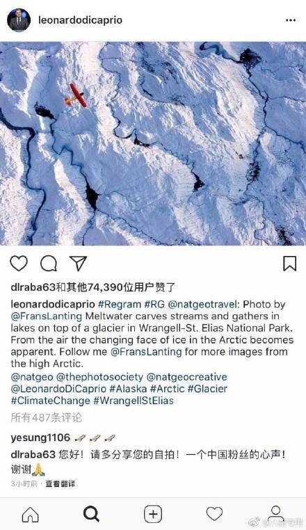 近日,好莱坞男星莱昂纳多在ins上呼吁大家关注全球变暖对北极冰面的影响,女星迪丽热巴在下面用中文留言,写到“您好,请多发您的自拍!一个中国粉丝的心声!谢谢”。