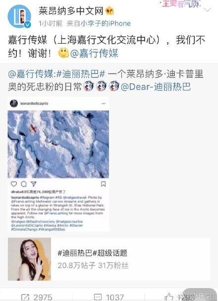 迪丽热巴经纪公司嘉行传媒将截图po到微博上,说“迪丽热巴——一个莱昂纳多·迪卡普里奥的死忠粉的日常”。随后,@莱昂纳多中文网转发其微博,并打脸回复“我们不约,谢谢”。