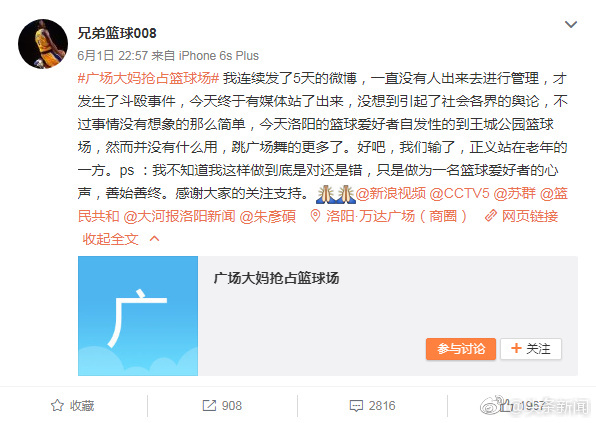 6月1日,据网友@兄弟篮球008 称,“大战”之前他已连续4天发布双方矛盾,但一直没人出面管理,跳广场舞的更多了。