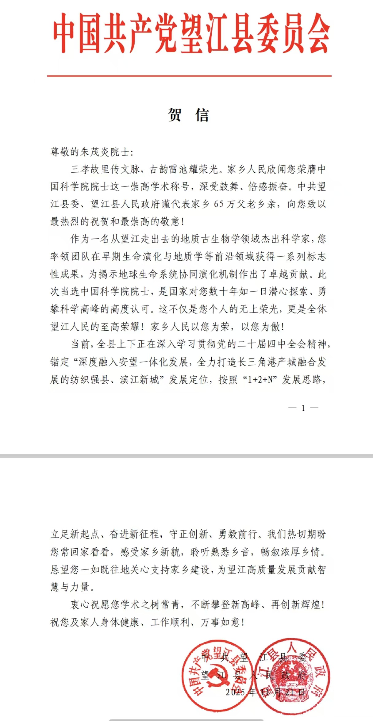 当天,望江县向朱茂炎院士发出贺信,信中致以祝贺和敬意。