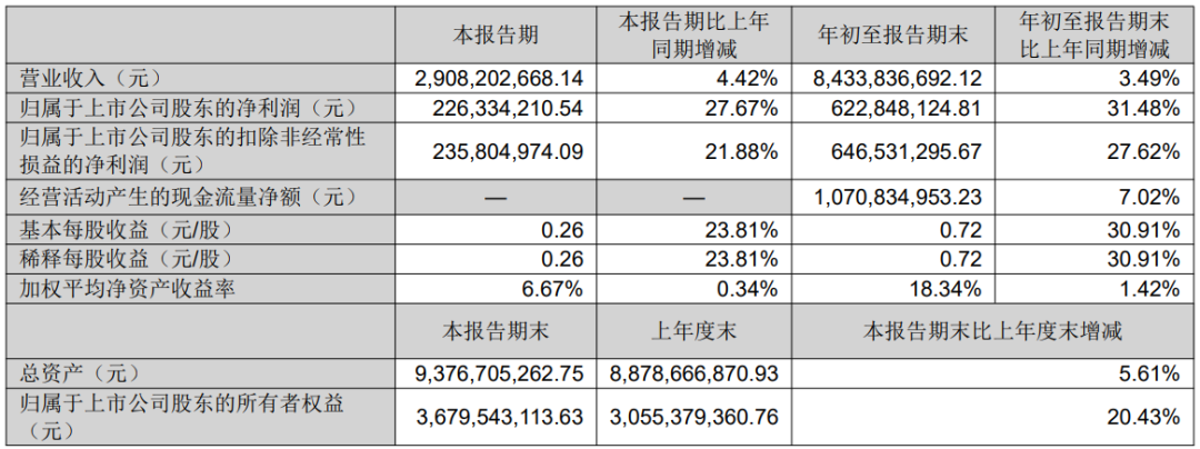 2025年1-9月,新乳业实现营业收入84.34亿元,同比增长3.49%;归母净利润6.23亿元,同比增长31.48%。