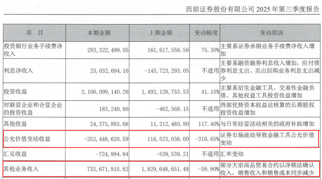 西部证券成为唯一一家营收下降的A股券商,主要受两大因素影响:一是公允价值变动收益由2024年同期的盈利1.17亿元变成亏损2.52亿元,较2024年同期减少3.69亿元。根据西部证券解释,主要因证券市场波动导致金融工具公允价值变动。二是其他业务收入7.34亿元,较2024年同期减少10.96亿元,降幅59.9%,主要因部分大宗商品贸易合约以净额法确认收入,销售收入和销售成本同步减少。