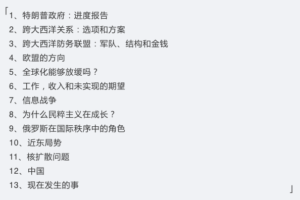 这13项议题几乎多多少少都与特朗普有关。其中议题最重要的前四项与特朗普直接紧密相关,乍看上去此次会议几乎就像是为了应对特朗普而专门召开的会议。