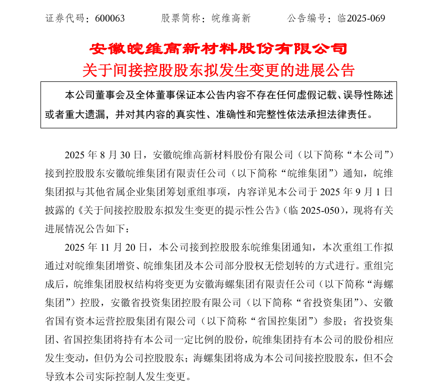 11月21日,安徽皖维高新材料股份有限公司(下文简称“皖维高新”)发布公告称,2025年8月30日,公司接到控股股东安徽皖维集团有限责任公司(下文简称“皖维集团”)通知,皖维集团拟与其他省属企业集团筹划重组事项,现公布有关进展情况。