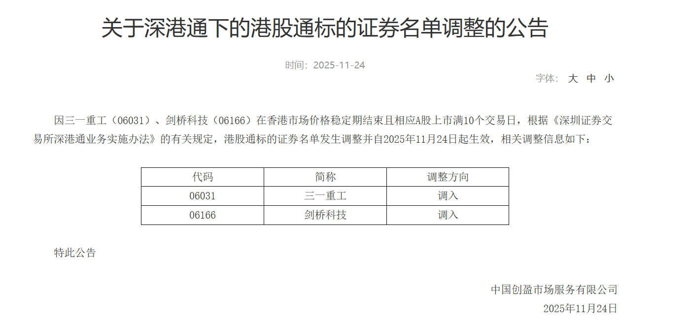 深交所11月24日公告 ,港股通标的证券名单发生调整并自2025年11月24日起生效,调入三一重工、剑桥科技。