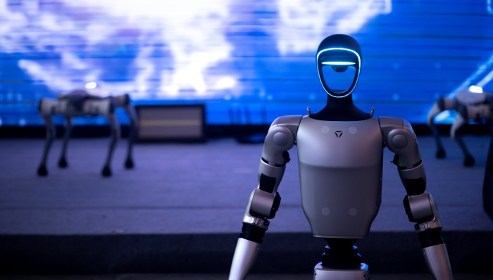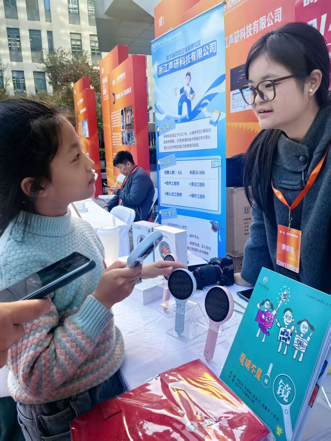11月21日下午,在杭州拱墅区运河发布中心一楼,六个男孩(杭州)智能科技有限公司的魔镜、杭州飞阔科技有限公司二次研发的宇树机器人等展品前聚集了不少观众。