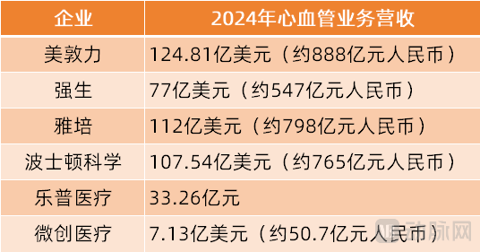 而国内头部企业乐普医疗在心血管领域的成熟产品线主要覆盖冠脉介入和结构性心脏病市场,2024年营收约33.26亿元人民币。微创医疗2024年相关业务营收约7.13亿美元(50.7亿元人民币)。可以看到,美敦力、强生等全球心血管巨头相关营收均超500亿元人民币,而国内心血管龙头营收则是30亿-50亿元人民币,相差超10倍,国内企业还有巨大提升空间。