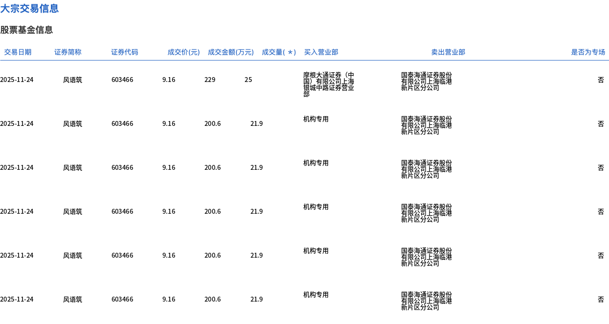 11月24日,风语筑大宗交易成交134.5万股,成交额1232万元,占当日总成交额的2.49%,成交价9.16元,较市场收盘价10.4元折价11.92%。