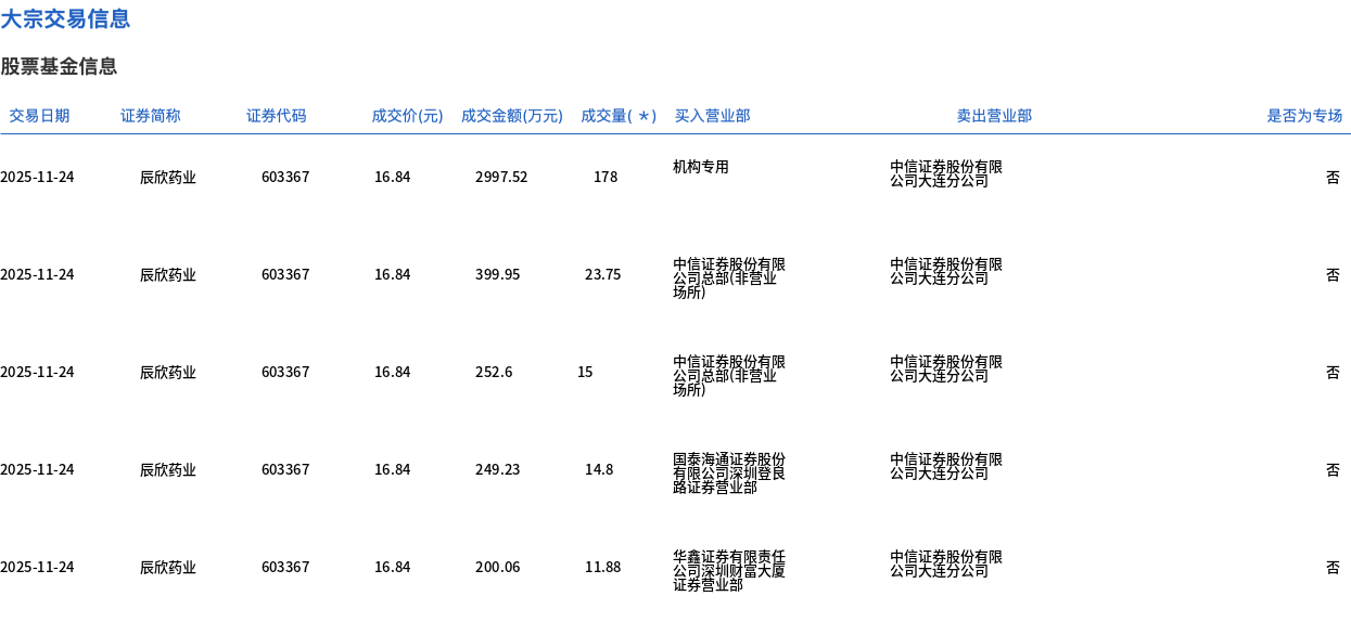 11月24日,辰欣药业大宗交易成交243.43万股,成交额4099.36万元,占当日总成交额的14.38%,成交价16.84元,较市场收盘价18.36元折价8.28%。