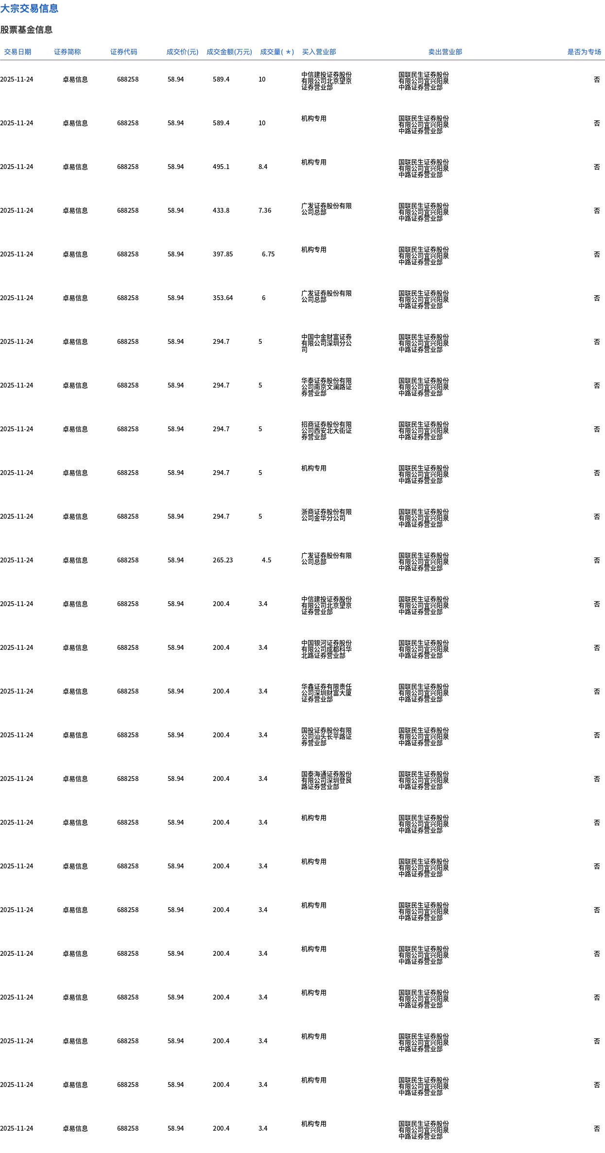 11月24日,卓易信息大宗交易成交156.01万股,成交额9195.3万元,占当日总成交额的10.73%,成交价58.94元,较市场收盘价70.06元折价15.87%。
