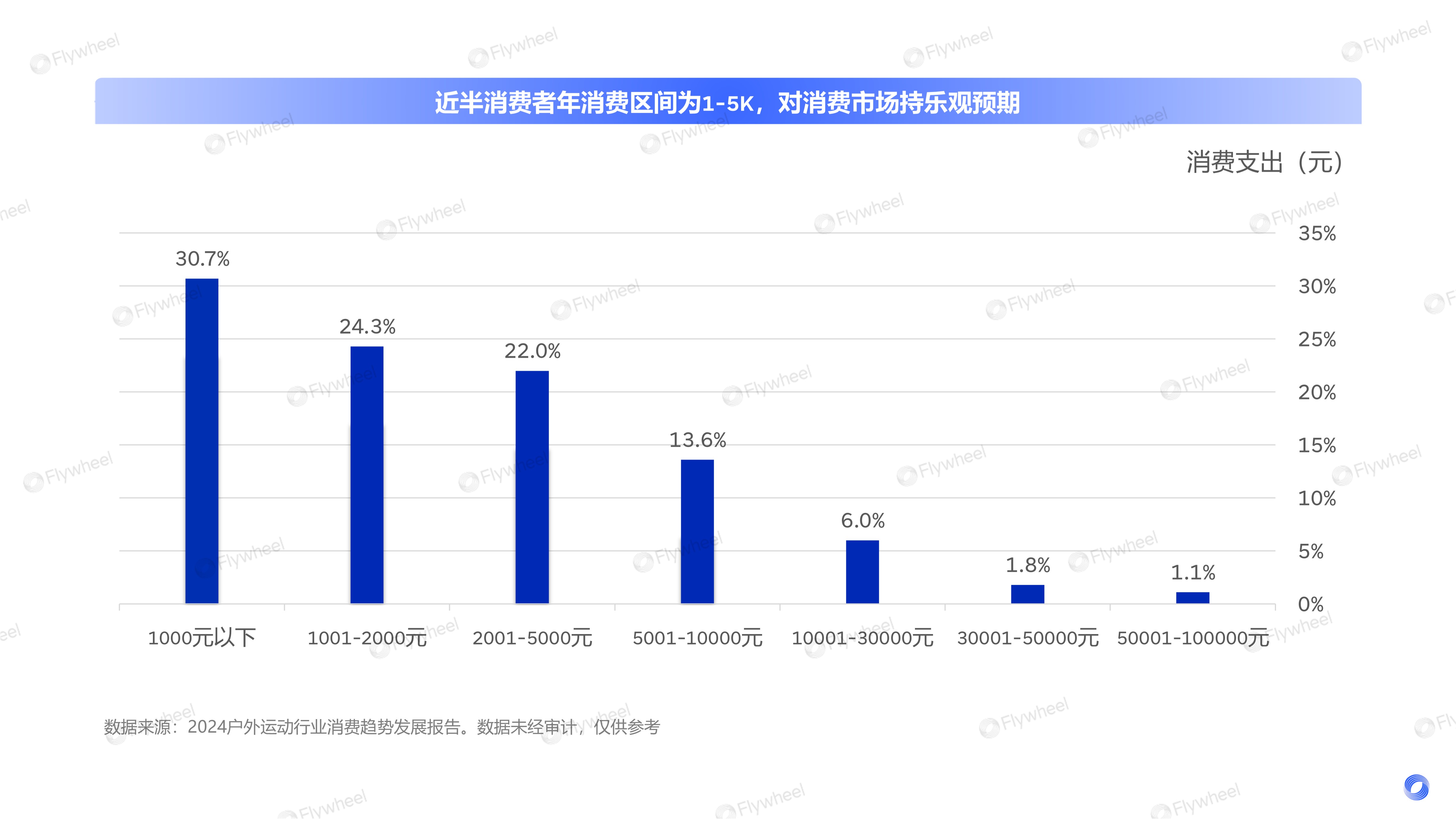 户外热潮同样体现在消费支出上。近年来,部分户外装备价格上涨,露营装备的客单价从2020年的800元,涨到2025年预估的2200元。尽管如此,还有46.3%消费者的人均年户外消费在1000至5000元之间,8%的人群愿意每年为户外运动花费超10000元。