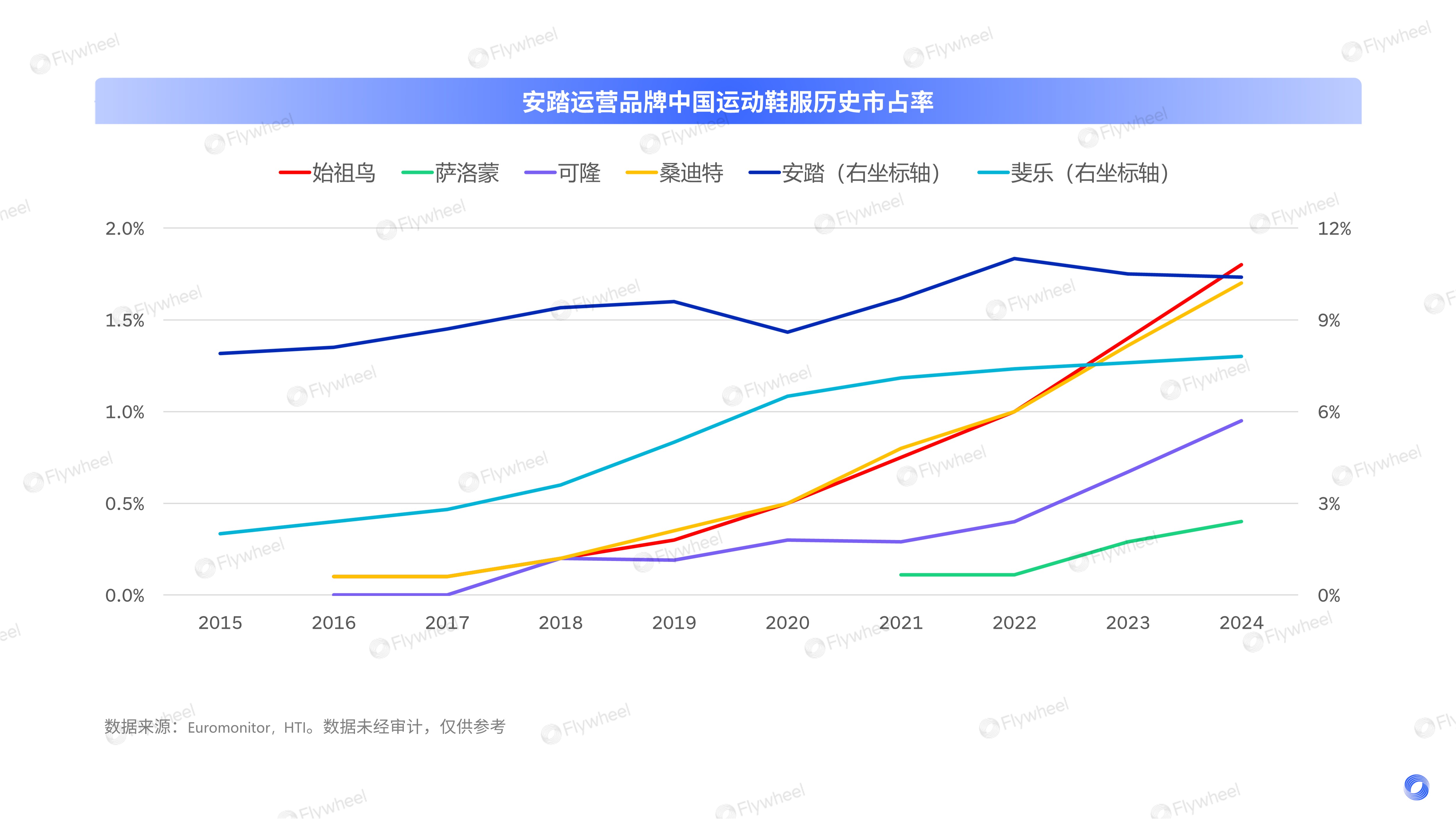 在国内,安踏的市占率同样持续攀升。通过收并购策略,安踏构建起了覆盖中高端市场的多品牌矩阵,包含始祖鸟、萨洛蒙、桑迪特、可隆、狼爪等知名户外品牌,并以23%的市场整体份额,成为中国运动鞋服领域的龙头。