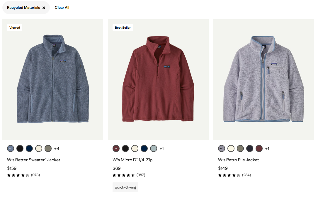 在产品生产制作中,巴塔通过回收再造,减少对石油资源的依赖以及CO₂的排放量。2023年秋季,巴塔的羊毛产品由89%的再生羊毛制成;2024年春季系列中,Patagonia 98%的生产线均使用回收材料。除此之外,再生羽绒、再生渔网、再生弹性纤维、回收热塑性聚氨酯、再生尼龙等也都是巴塔的原材料。
