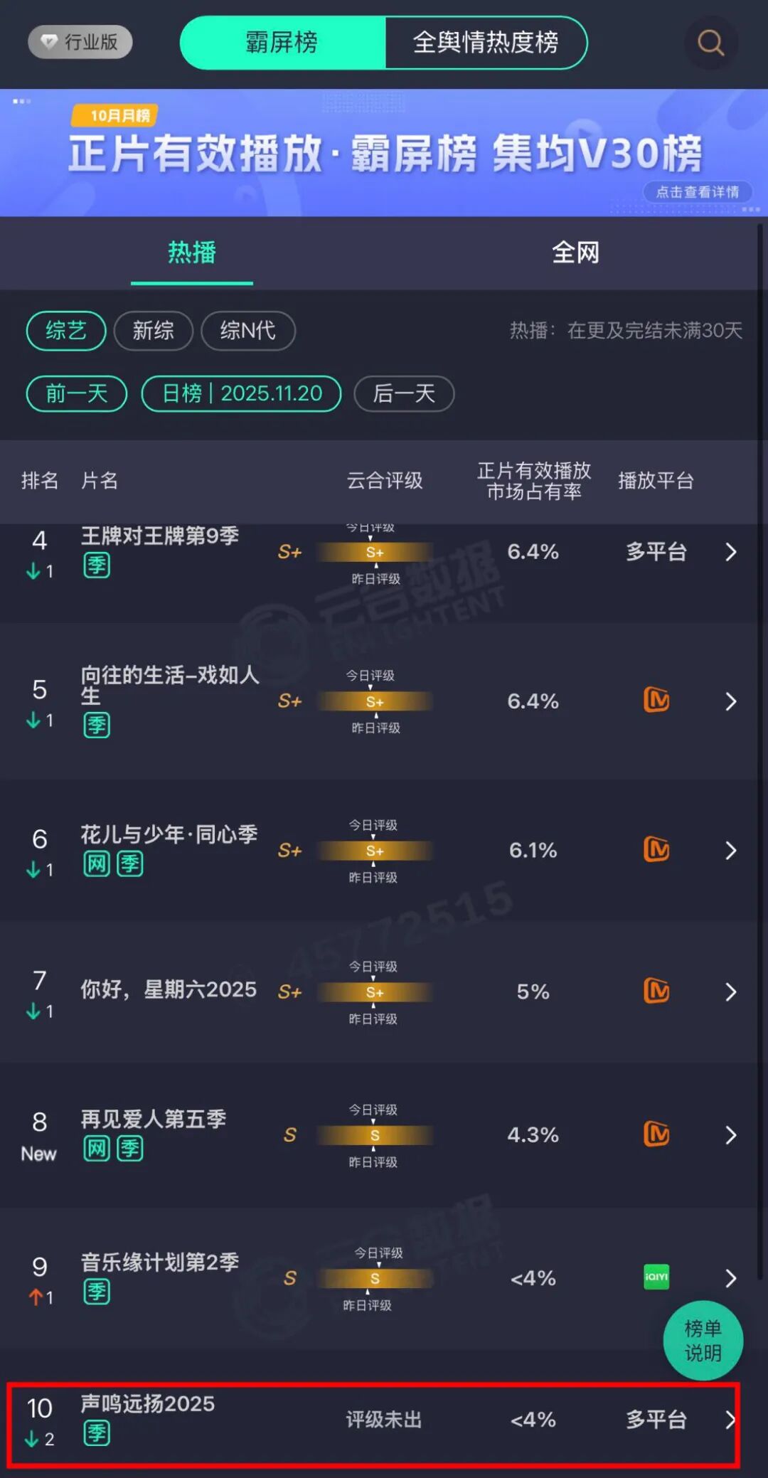 截至发稿,《声鸣远扬2025》最新云合市占率不足4%,最高峰值也不过8.5%,未能超越《歌手2025》8.8%的成绩。无独有偶,在猫眼、灯塔等其他第三方数据榜单上,其也明显缺乏存在感。
