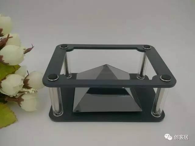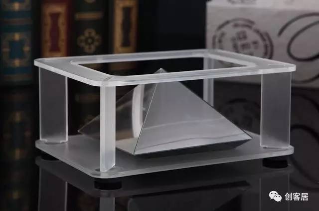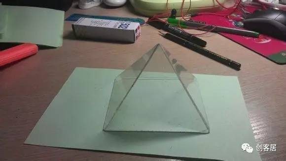 这个简易版的全息投影仪最主要的部件就是用透明塑料片搭起的“金字塔”,其实网上有两种做法,一种是有尖的一种是无尖的,两者原理一样,无尖的只是为了能够方便的倒放在屏幕上而已。