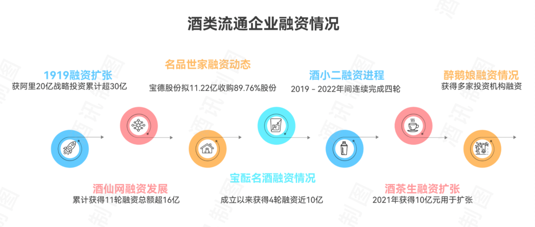 2021年前后,酒类流通赛道迎来一波资本密集涌入期。宝酝名酒成立以来获得 4 轮融资,累计近 10 亿元,投资机构包括中金资本、经纬中国、清流资本等;酒小二在 2019—2022 年间连续获得腾讯、红杉中国等机构投资,完成四轮融资;酒茶生则在 2021 年获得10亿元投资,用于全国直营系统扩张;醉鹅娘亦获得了来自沣途资本、青骢资本、真格基金等机构的融资……