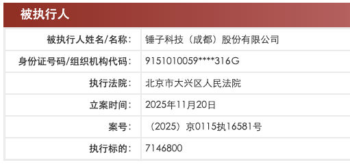 中国执行信息公开网显示,11月20日,锤子科技(成都)股份有限公司新增1条被执行人信息,执行标的714.68万元,执行法院为北京市大兴区人民法院。
