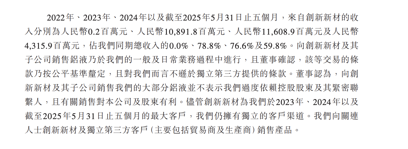 由此形成的紧密业务关联,使得创新新材成为创新实业的最大客户。招股书显示,公司来自创新新材的收入分别占同期总收入的78.8%和76.6%。