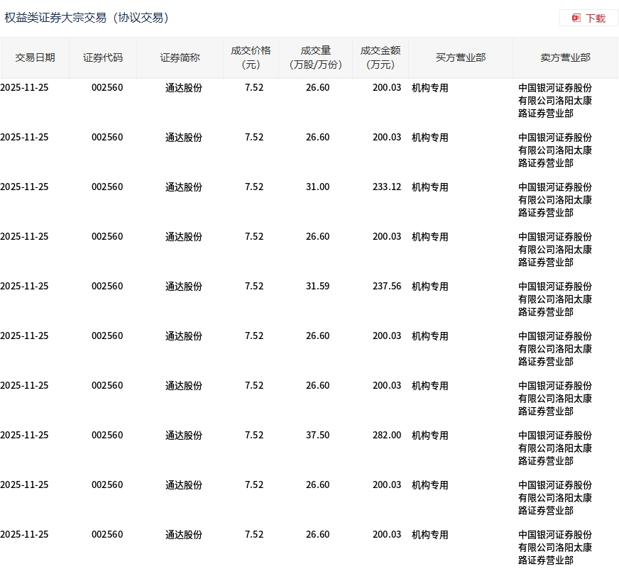 11月25日,通达股份大宗交易成交286.29万股,成交额2152.89万元,占当日总成交额的9.68%,成交价7.52元,较市场收盘价8.33元折价9.72%。